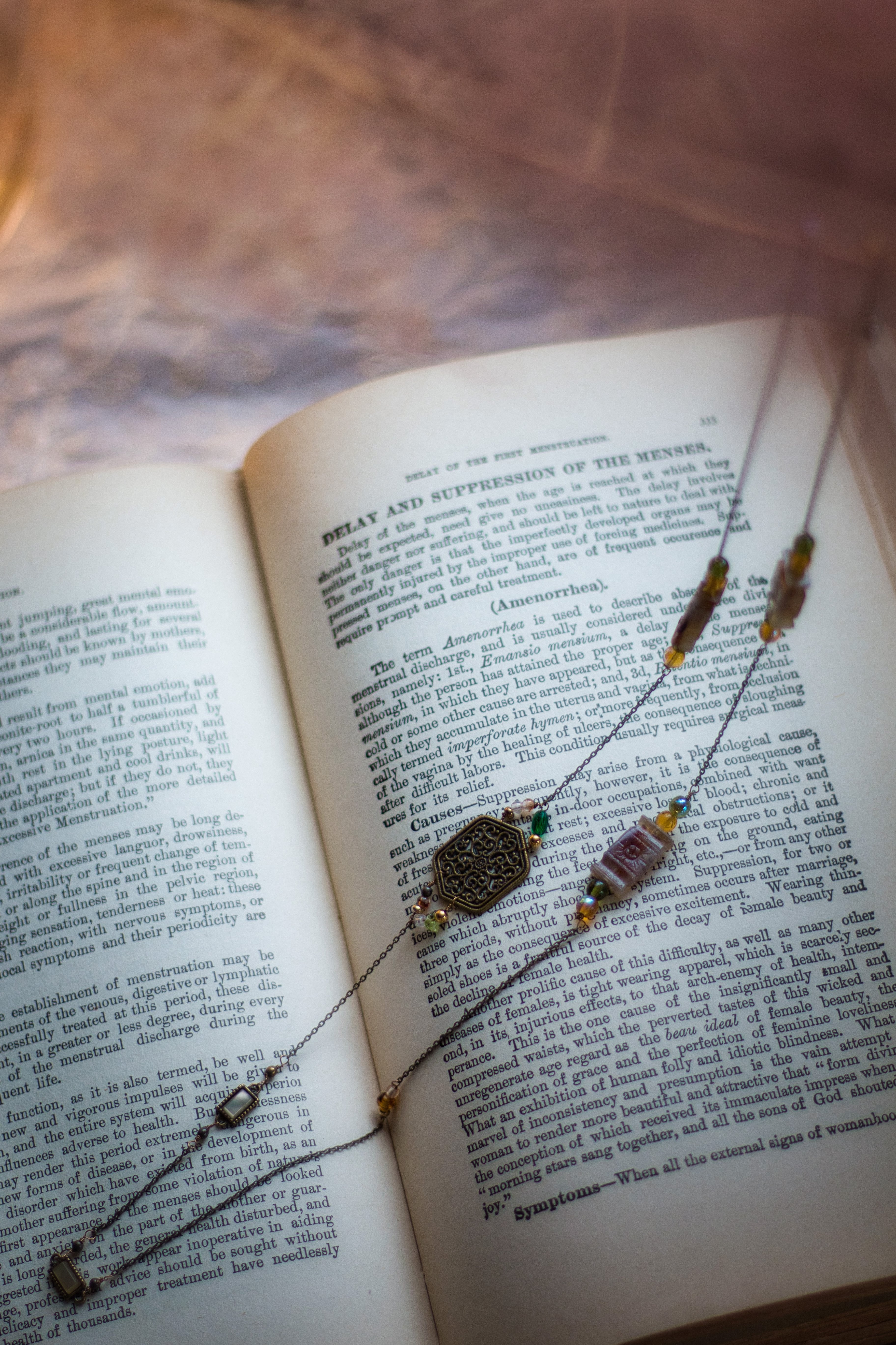 アンティーク市で見つけたブラウンのビーズパーツには太陽のような文様が刻まれています。